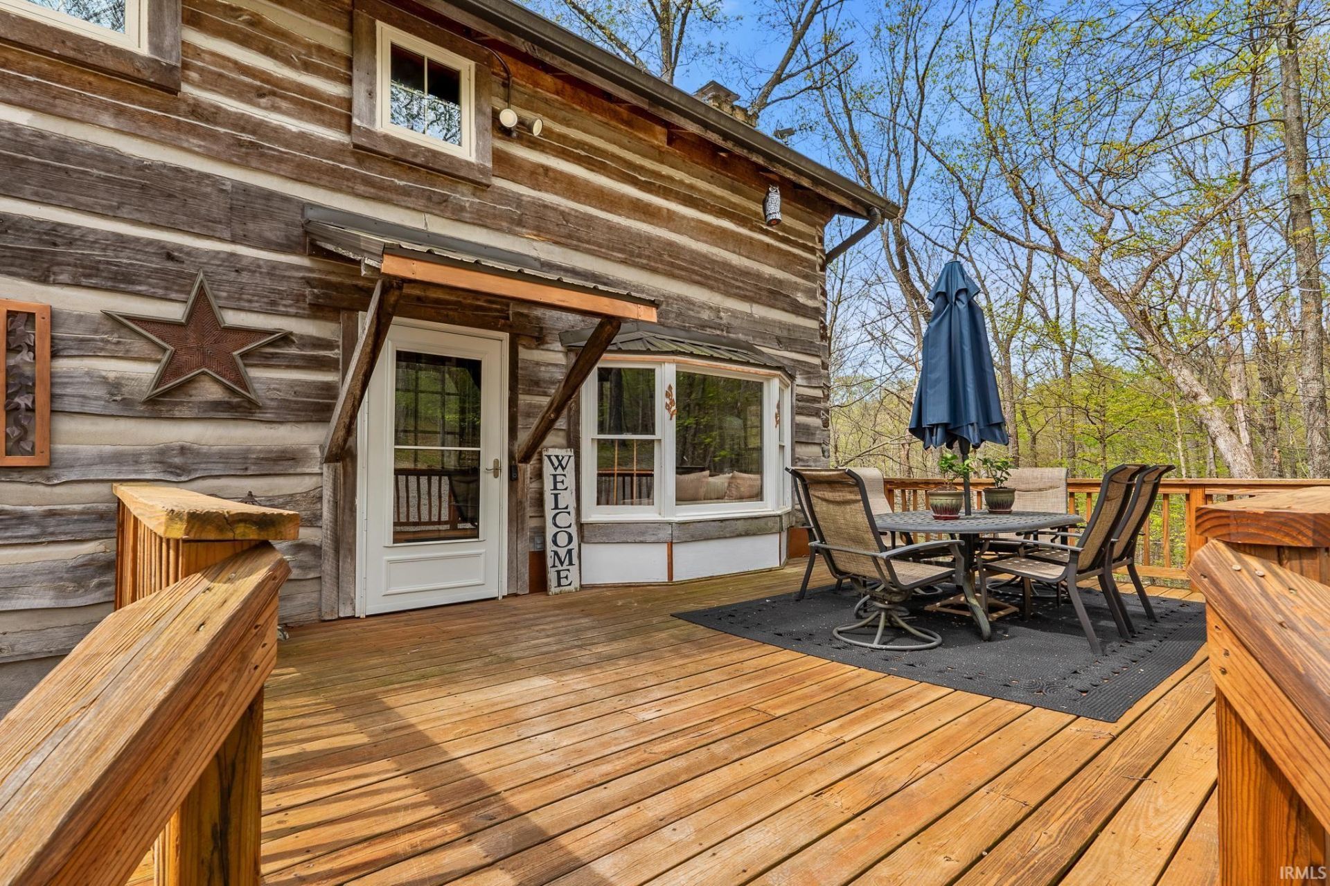 Lost & Found Cabin offers a rare opportunity to own a true Brown County log home with a Tourist Rental Exception already in place. Although it has not been used as a short-term rental since 2019, the exception remains, and the current owners hold a valid permit?allowing you to begin renting immediately. Set on 5 private wooded acres, this custom-built log cabin blends rustic charm with modern updates. Enjoy peaceful views from every window, relax on multiple decks, or unwind in the hot tub surrounded by nature. Inside, you'll find hardwood floors, exposed beam ceilings, poplar hardwood doors and trim, mortise locks and hardware, custom hardwood countertops, and two gas log fireplaces?one in the living room and one in the primary bedroom. The finished basement expands the home's functionality and entertainment space, featuring a pool table along with additional sleeping options including a Murphy bed and sleeper sofa?ideal for guests or short-term rental flexibility. The home is being sold fully furnished, including all kitchen dishes, cookware, and essentials, making it truly turnkey. Recent updates include a beautifully renovated kitchen, new stainless steel appliances, new mini-split heating and cooling units throughout the home (including the garage), and updated basement flooring. Outdoor living is just as inviting, with both a gas fire pit and a wood-burning fire pit for year-round enjoyment. The 30' x 40' detached garage offers excellent versatility with new windows, an upper-level storage area, and a 30' x 15' finished room perfect for a workshop, studio, gym, or hobby space. A low-maintenance metal roof adds peace of mind, and additional inclusions such as a generator, extra freezer in the garage, and Traeger grill further enhance the value. If you've been dreaming of a private cabin in the woods with income potential, modern comforts, and authentic Brown County character, Lost & Found Cabin is a must-see.